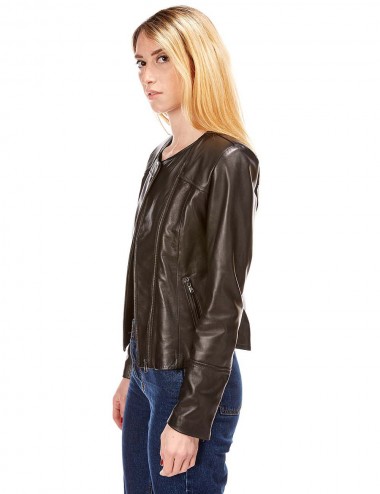 Sophie est un blouson en cuir d’agneau, fermé par un zip asymétrique et terminé par un petit col rond.