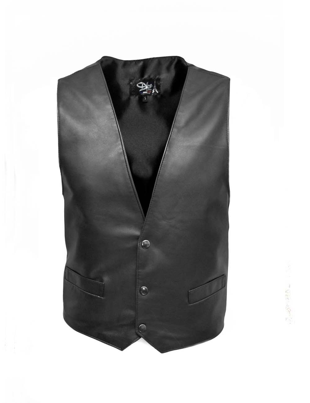 Ce gilet en cuir sans manche aux allures de gilet façon garçon de café peut se porte par-dessus une chemise ou un t-shirt.