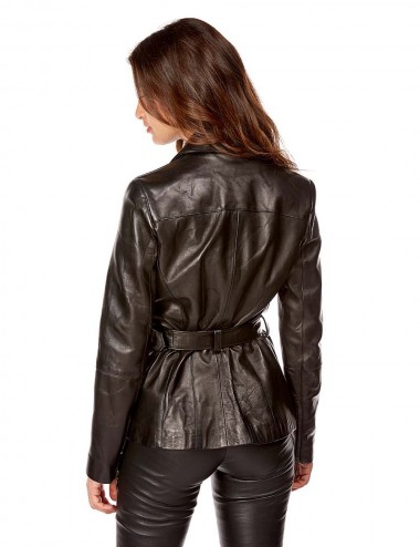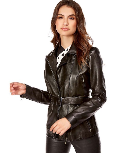 La veste en cuir d'agneau ,se ferme par un zip asymétrique style Perfecto revisité , avec deux poches extérieure zippées